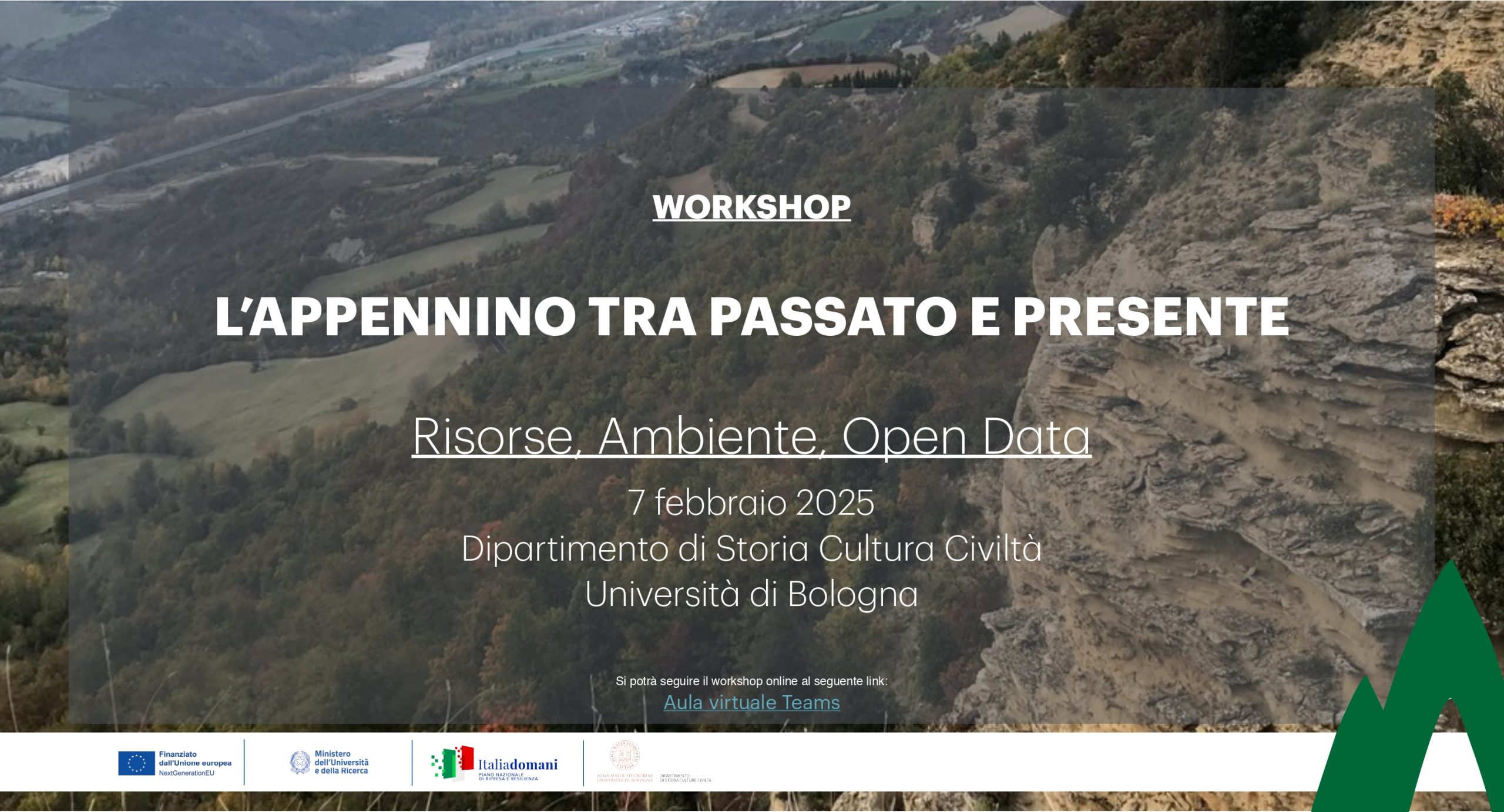 Vai al link dell’organizzatore: https://disci.unibo.it/it/eventi/l-appennino-tra-passato-e-presente-risorse-ambiente-open-data
