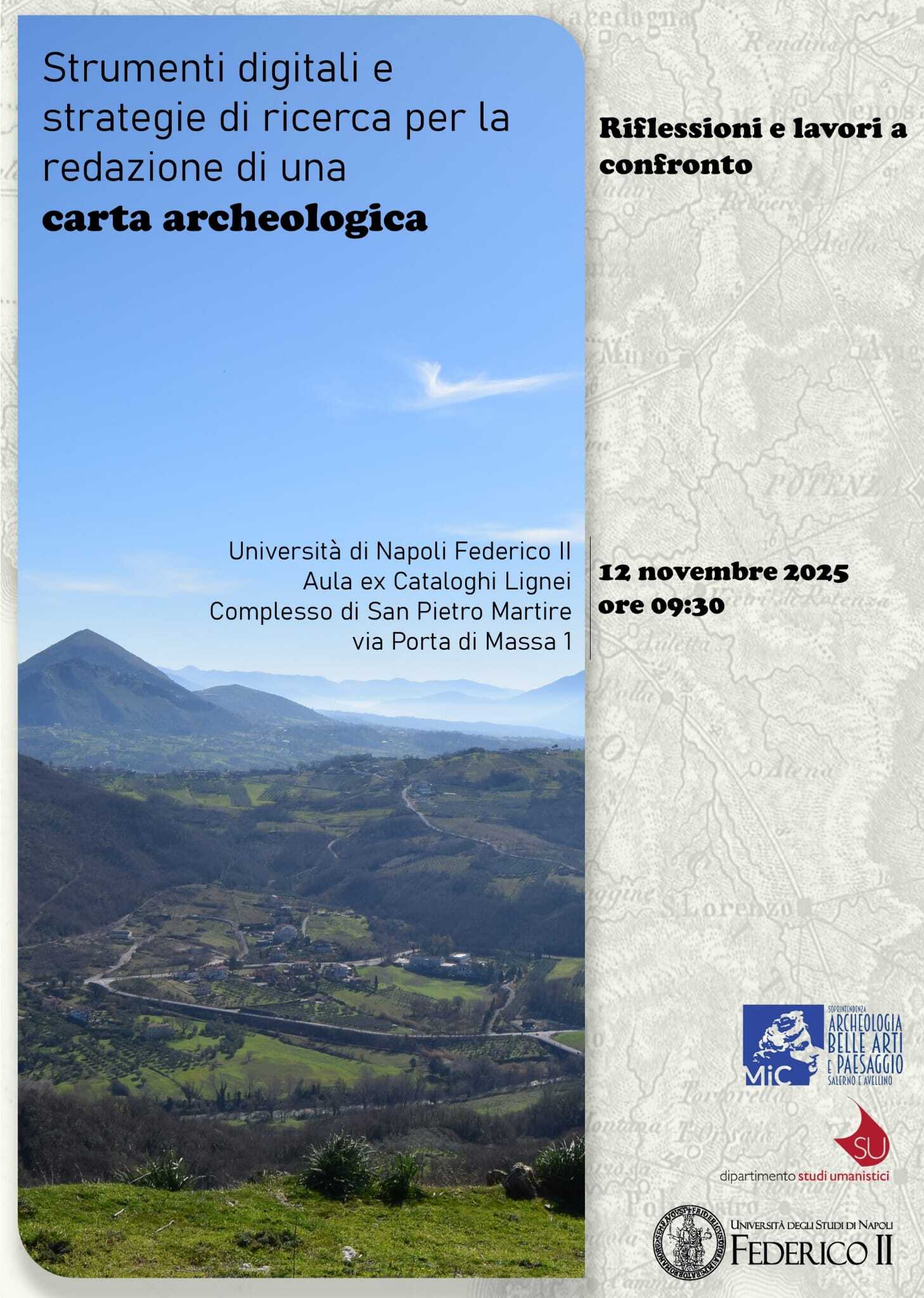 Il 12 novembre 2025 l’Istituto Centrale per l’Archeologia (ICA) partecipa alla giornata di studi “Strumenti digitali e strategie di ricerca per la redazione di una carta archeologica. Riflessioni e lavori a confronto”, in programma presso l’Università degli Studi di Napoli Federico II (Complesso di San Pietro Martire) e fruibile anche da remoto tramite piattaforma Teams.